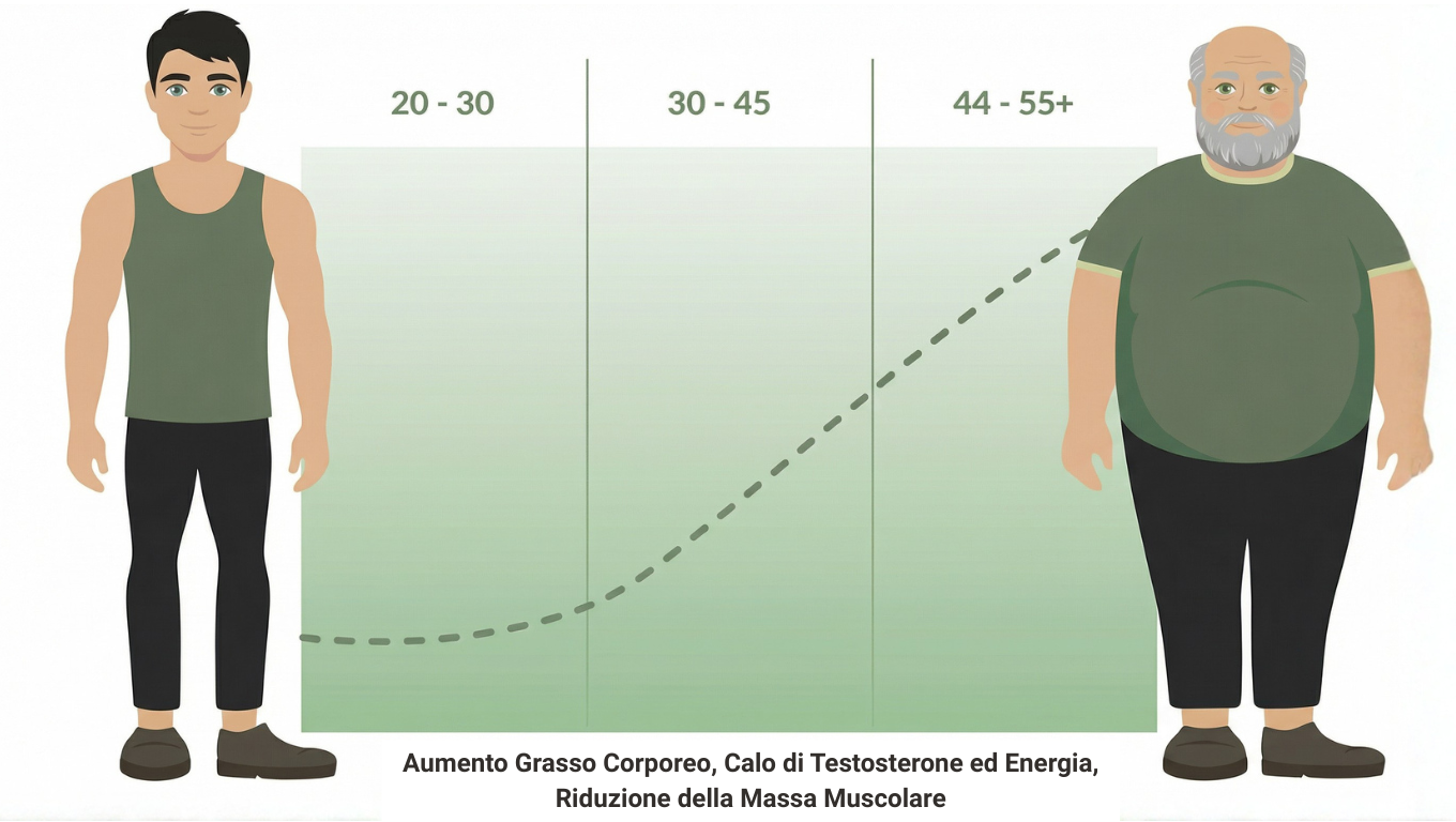 Durante l’andropausa, il calo del testosterone e un fegato meno efficiente nello smaltire gli estrogeni alterano il metabolismo, favorendo grasso addominale, calo della massa muscolare, stanchezza e riduzione della vitalità.